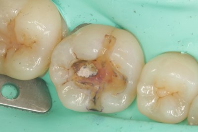 またある研究では、治療後5年前後で再治療の必要性が出てくる、というものもあります。それを表しているのが次の症例です。詰め物を外してみると、内部が虫歯に侵されていることがわかると思います。
