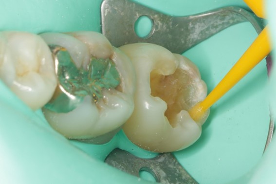 中に虫歯の感染を確認。削らずに虫歯を除去。