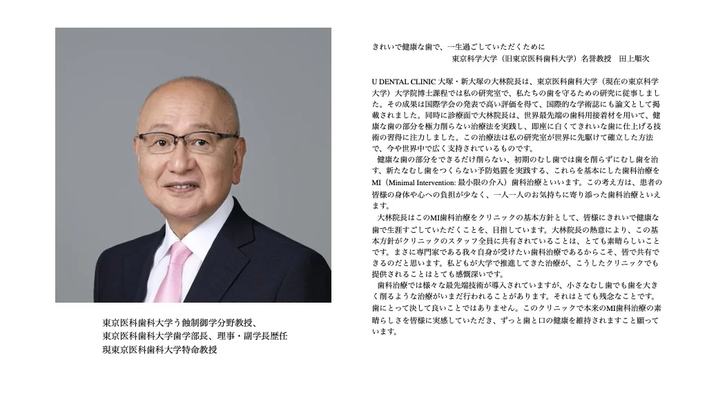 当院の院長Dr.大林は、東京科学大学(旧東京医科歯科大学)名誉教授の田上純次から接着修復治療を学びました。接着修復治療を活用した治療は日本が最高峰とされ、Dr.田上はその第一人者とも呼べる存在です。世界中の歯科医師がDr.田上の下に集まり、その知識と技術力は世界の田上と呼ばれるほどです。